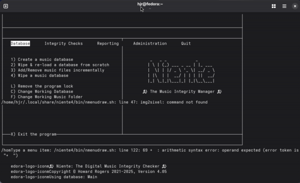 A fresh install automatically installs the Kitty terminal and libsixel components needed to get that graphical logo displayed correctly. For a mere upgrade, you have to take care of those extra component requirements manually, I'm afraid. It is a once-off requirement! I did find that even on fresh installations, Niente would look ghastly until you had taken the Administration menu, Option 1 and pressed [Enter] to create a new persistent configuration file: it's a quirk of the transition, sadly.