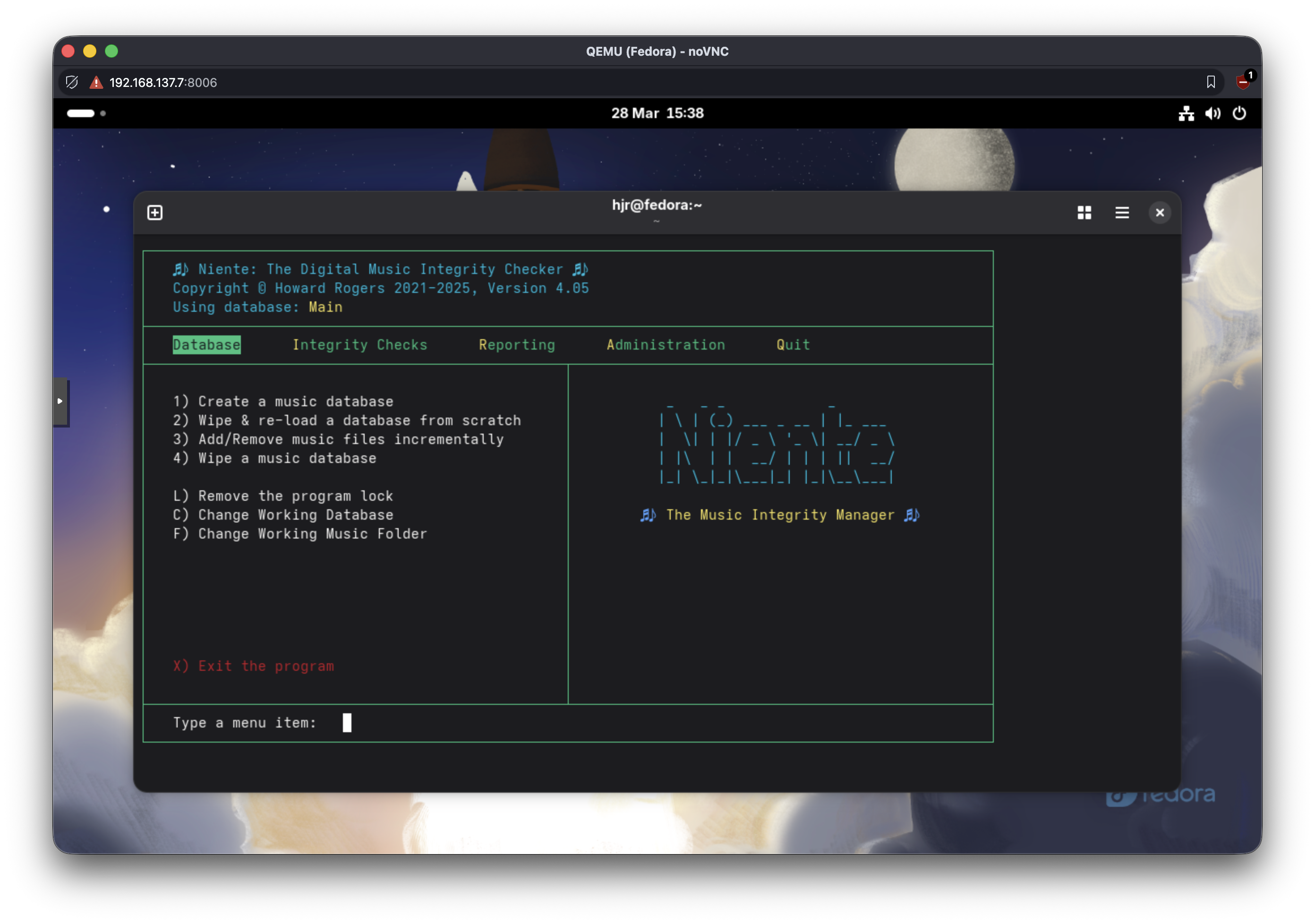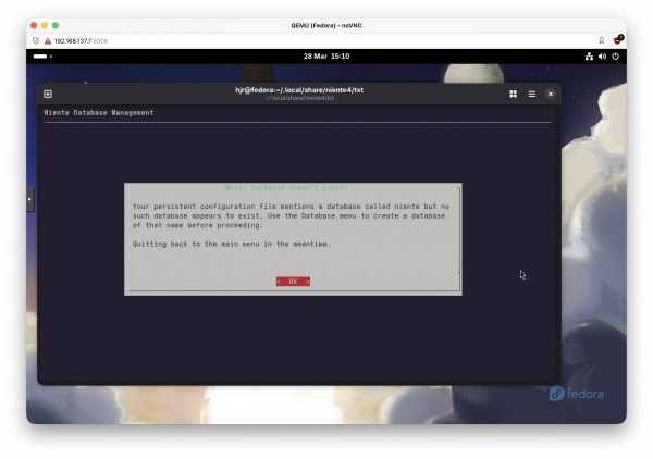 Now you can re-launch Niente (on AlmaLinux, this must be from within Kitty): you will likely be warned that your new, default configuration file mentions a database called “niente” (the default name), but that no such database exists: