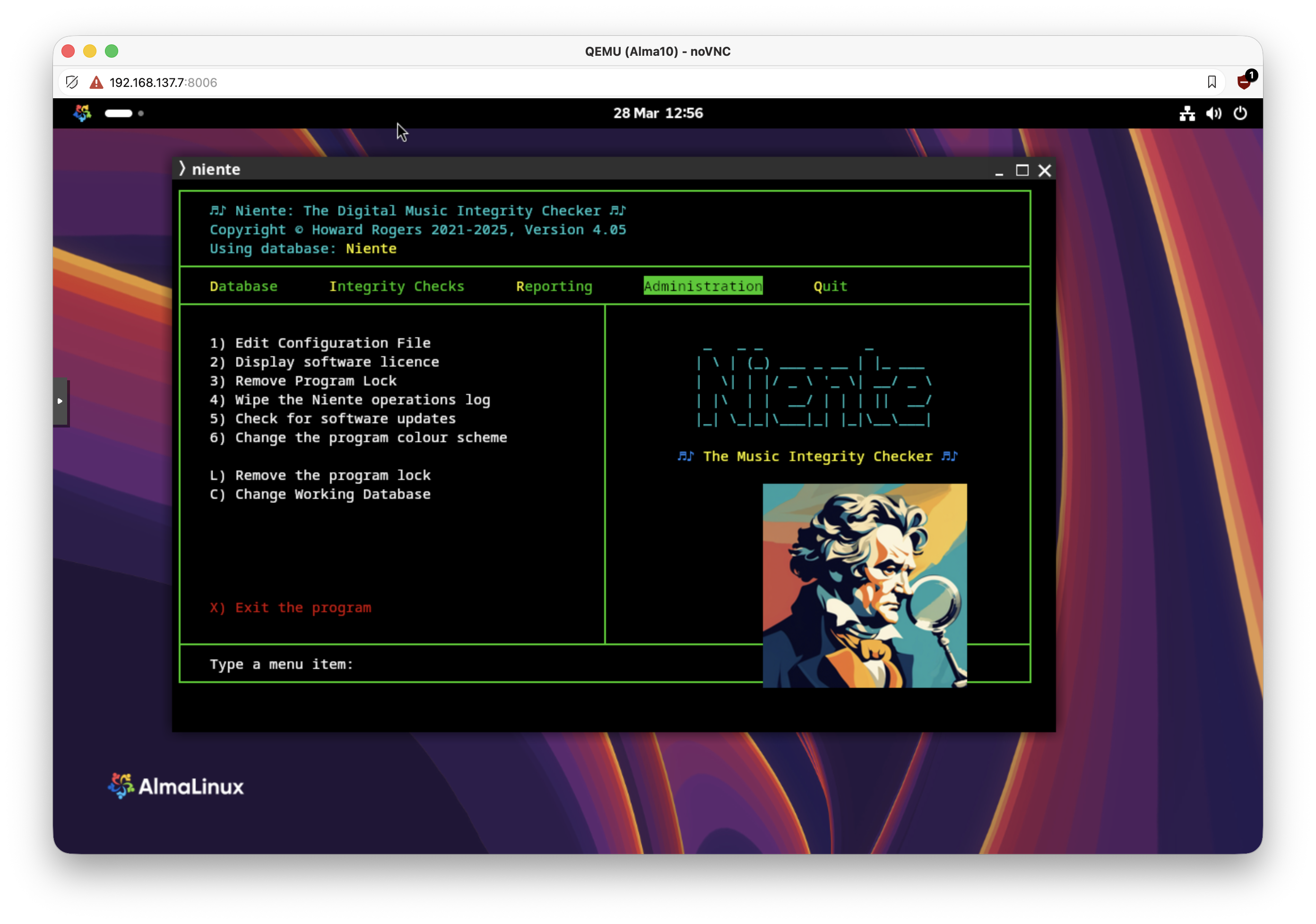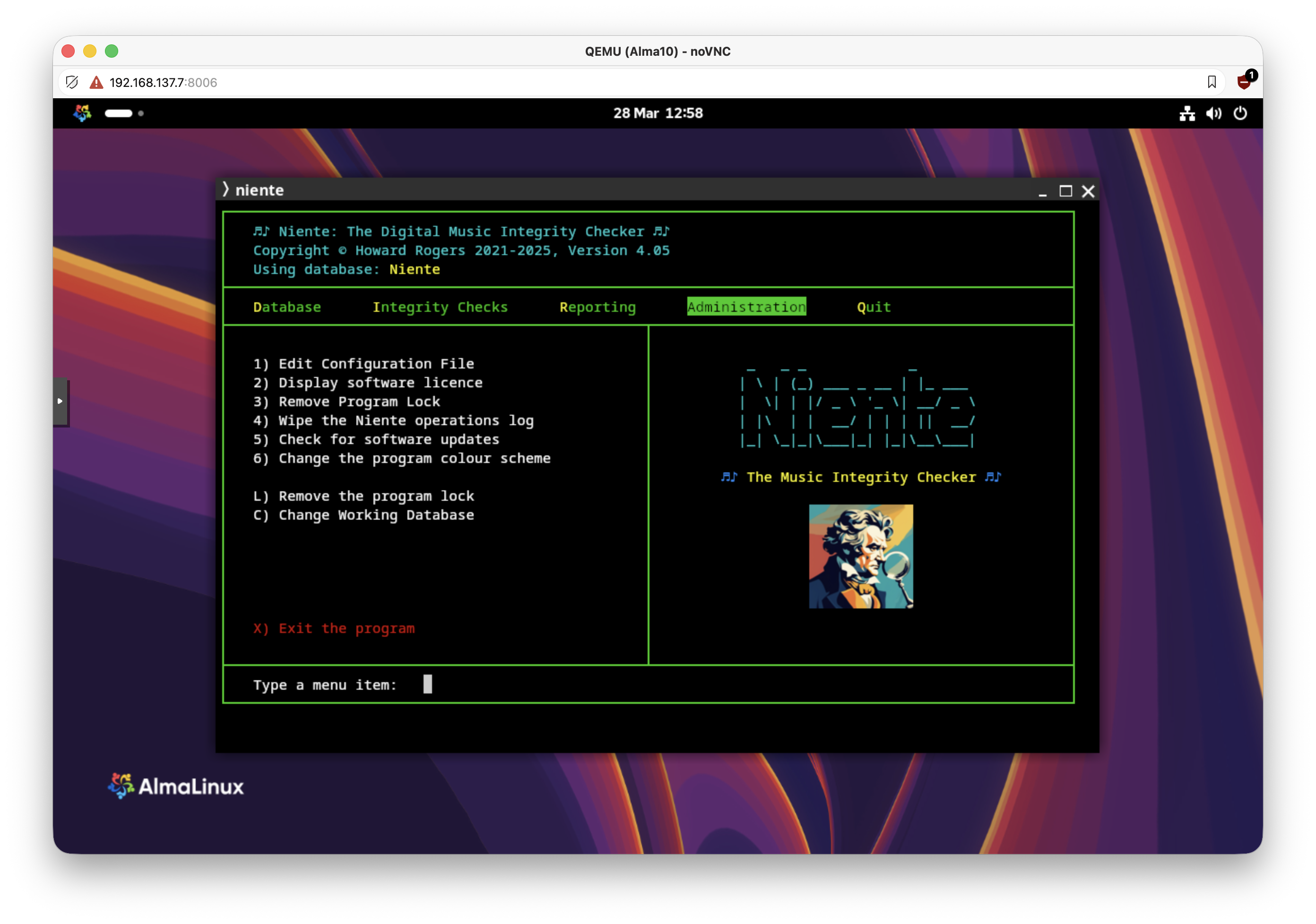 I should explain that I cannot find a way to install sixel graphics support on AlmaLinux 9 or 10, so we don't bother and instead install the Kitty terminal, which is a completely different ball-game that still manages to install support for doing in-terminal graphics. Note that this means either that 1) you can't use 'gnome terminal“ to run Niente going forward; or 2) if you insist on using gnome-terminal, you're not going to see the 'beethoven looking grumpy' logo.