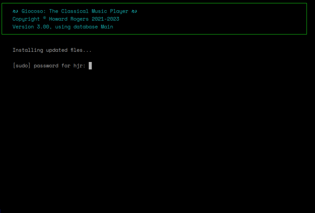 You will be prompted for the sudo password (because some of Giocoso's files need to be copied to /usr/bin which generally requires root-equivalent privileges). Type that in and press [Enter] again and the display will change once more to this: