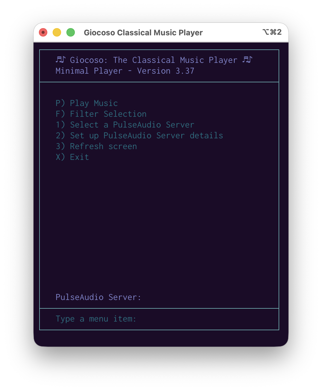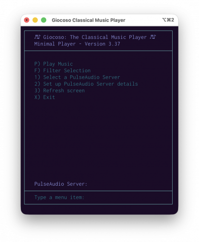 New Feature: MacOS can now do PulseAudio playback. That is, you can run Giocoso on your desktop iMac or Mac Mini and have the audio play via some other PC anywhere on your network. It's a bit fiddly to configure (article incoming!!), but so long as your Mac has the environment variable PULSE_SERVER set, and has a version of ffmpeg installed that works with PulseAudio, and there's a remote PC configured to act as a PulseAudio server, then you press play on the iMac and the sound comes out via a Debian box or an Arch PC.
