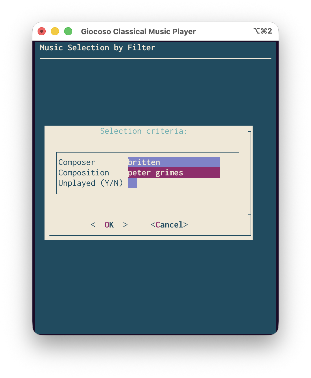 The vanilla “Play Music” option does a 'default, randomised' music selection, equivalent to taking Option 1 on full-fat Giocoso's Play Music menu. The new 'Filter Selection' option is the near-equivalent of taking Option 2 from that full-fat menu: it will display a cut-down selection of filters that let you pick specific things to play. For example, here I'm asking to play Britten's Peter Grimes: