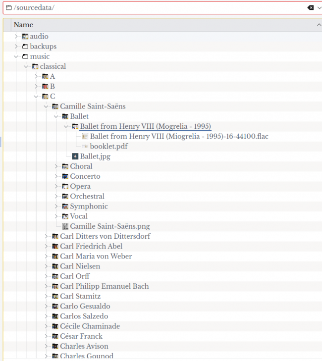From this screenshot of my file manager, you can see I keep all my music inside the /sourcedata folder -but that, within that, there is quite the forest of folders and sub-folders! Thus you see a particular FLAC file stored inside a folder whose full path is /sourcedata/music/classical/C/Camille Saint-Saëns/Ballet/Ballet from Henry VIII…. So the question is, what folder would, when pointed at, imply 'catching' all my FLACs in one go. It's no good me pointing at /sourcedata/music/classical/C, because though that would mean scanning Saint-Säens, Dittersdorf, Abel, Weber, Nielsen and others, I would not end up scanning and Aaron Copland or Benjamin Britten! Meanwhile, if I pointed at /sourcedata, that would catch too many FLACs -because I don't want anything in 'backups' or 'audio' to be catalogued as part of my music collection.