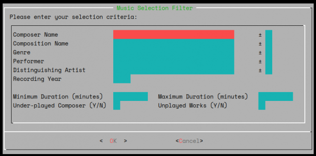 A full scan wipes every table in the database (apart from the PLAYS one, which obviously at the point of database creation has nothing in it anyway!) and populates it from scratch by extracting the metadata tags from every FLAC inspected, then aggregates the individual tracks into per-recording entries in the RECORDINGS table. When considering what data Giocoso takes from the FLAC files and stores in its database, it helps to think about what use it will eventually put that data… and the best example of that I can think of is the Play Music menu Option 2 search filter: