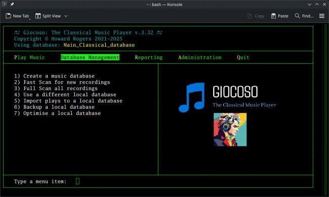 You might notice that the blue text at the top of the display now says you are using (in my case) 'Main_Classical_database': that indicates the newly-named database has been created and populated correctly and is ready to use: you could press P, then tap 1… and music chosen at random from your database will then begin to play. Be aware, however, that unless the Persistent Configuration File (see Administration menu, Option 2) lists (again, in my worked example) 'Main_Classical_database' as the default database, then the next time you launch Giocoso, this is not the database that will be used for other plays automatically.