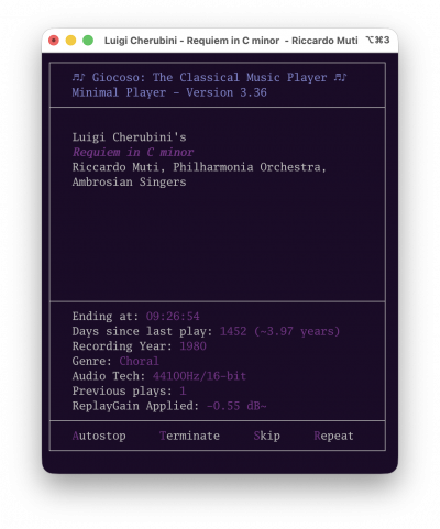 As music plays, the usual sort of 'play control' menu options are available at the bottom of the screen: Autostop (to allow the current play to continue but prevent progress thereafter to any new play); Terminate (to immediately halt the current play and to not progress to any other play, either); Skip (to immediately halt the current play but to progress to the next play, if any are available); and Repeat (to allow the current play to continue to completion and then to begin playing it again from the start). Play controls you would see when the full-fat Giocoso plays music (such as Pause, Volume and Notes) are not available in mini-mode.