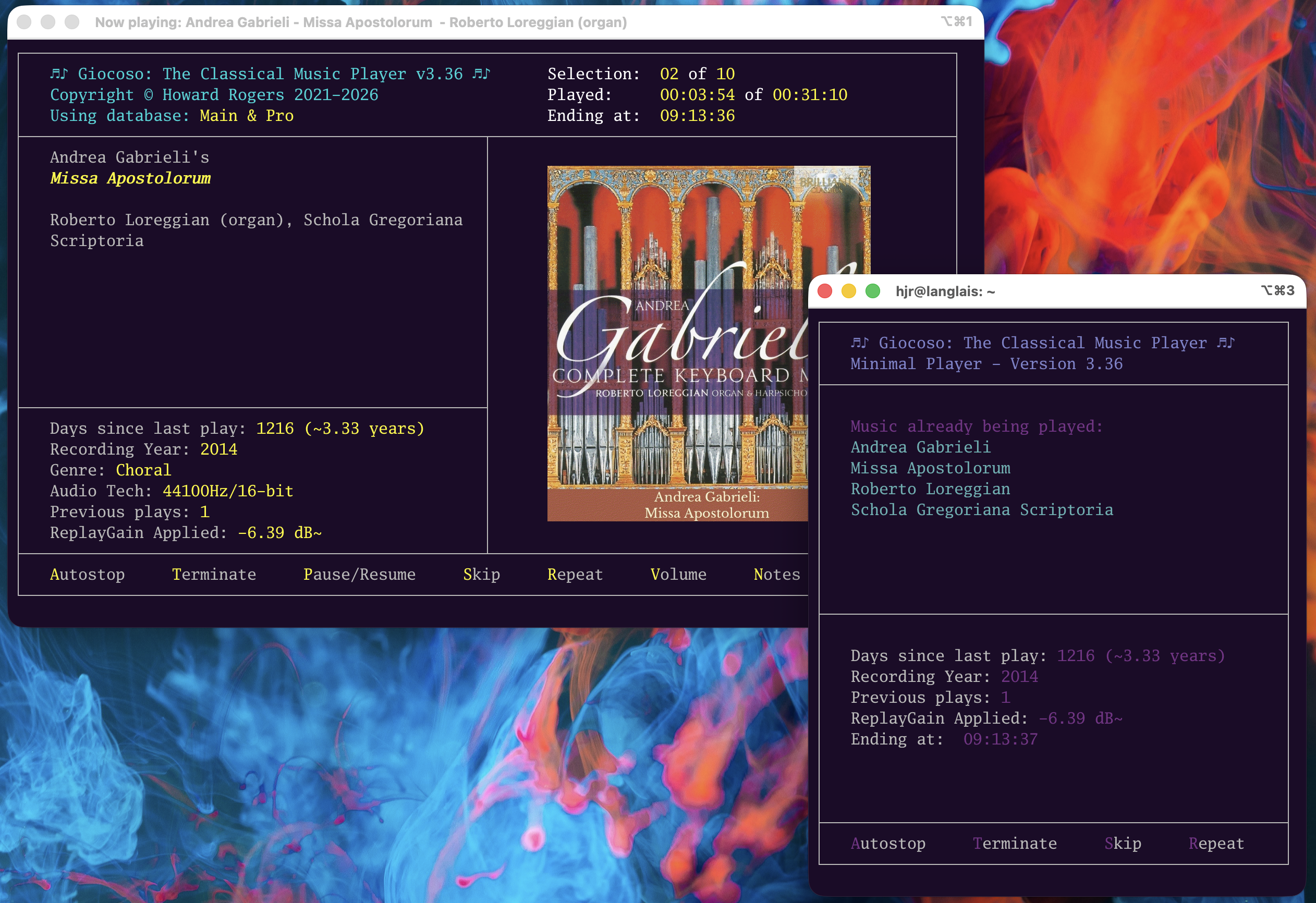 Here, for example, you see that some Gabrieli is playing in full-fat Giocoso on the left; the mini player has then been launched on the right: it immediately displays the details of what is already being played, rather than giving you the option to initiate music playback. The mini player's music play controls still function, however: if you press Autostop in the mini player, the Autostop option in the main player will light up, for example.