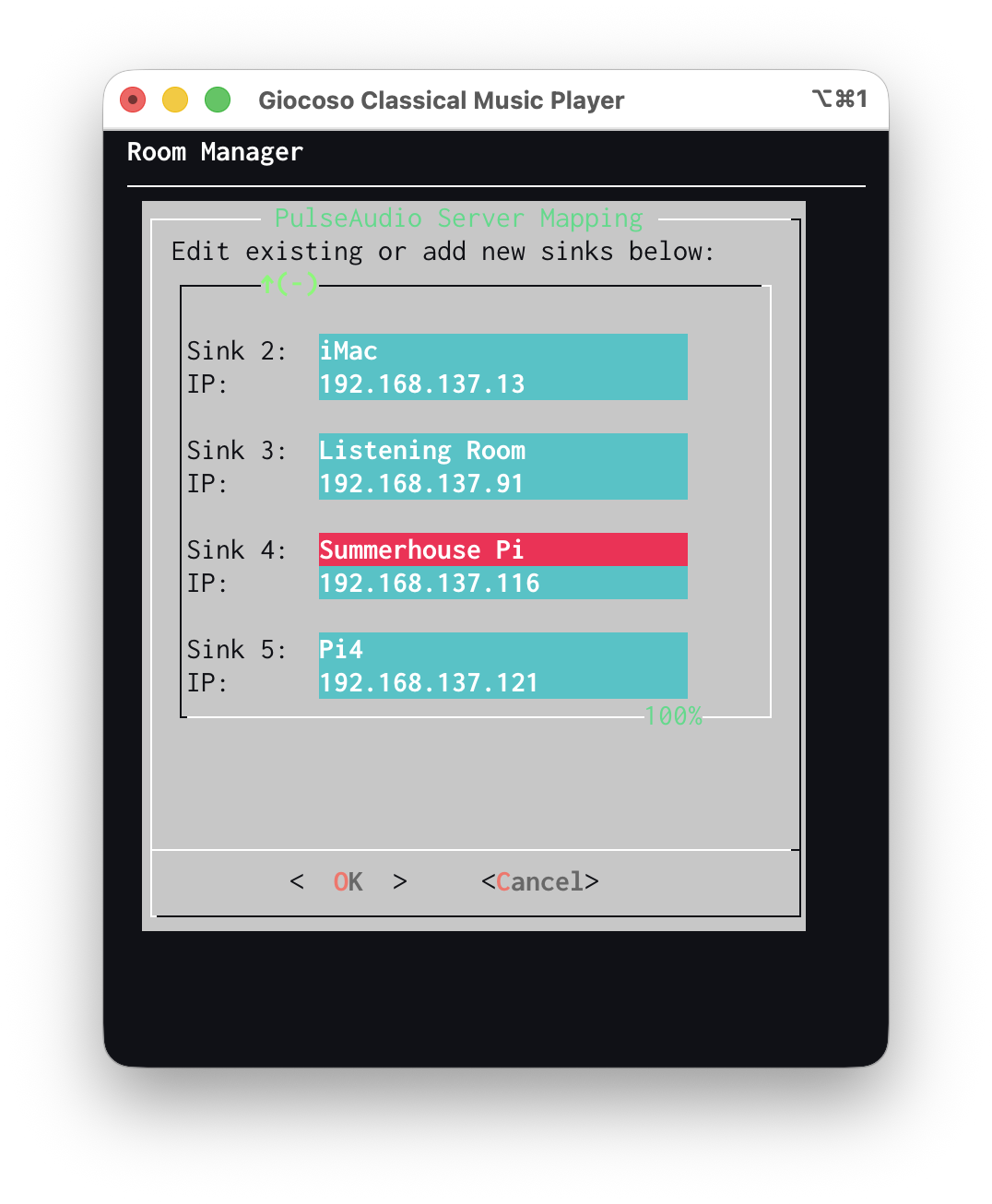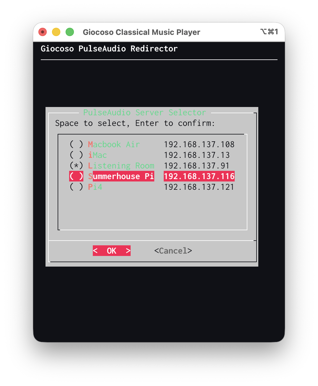 Once you've created a set of PulseAudio sinks and their associated IP addresses, you can select one of them using the mini player's Option 1: Select a PulseAudio Server menu item: