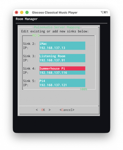 Note, however, that if the mini player is going to be run on a one of the PCs that you also listen to music on directly then it should be entered as its own possible sink. In other words, I also listen to music in the listening room: if this mini player is running on the listening room PC, I'll need the ability for the listening room PC not only to direct audio to the bedroom or summerhouse but also to itself… otherwise, I won't be listening to much in the listening room in future!