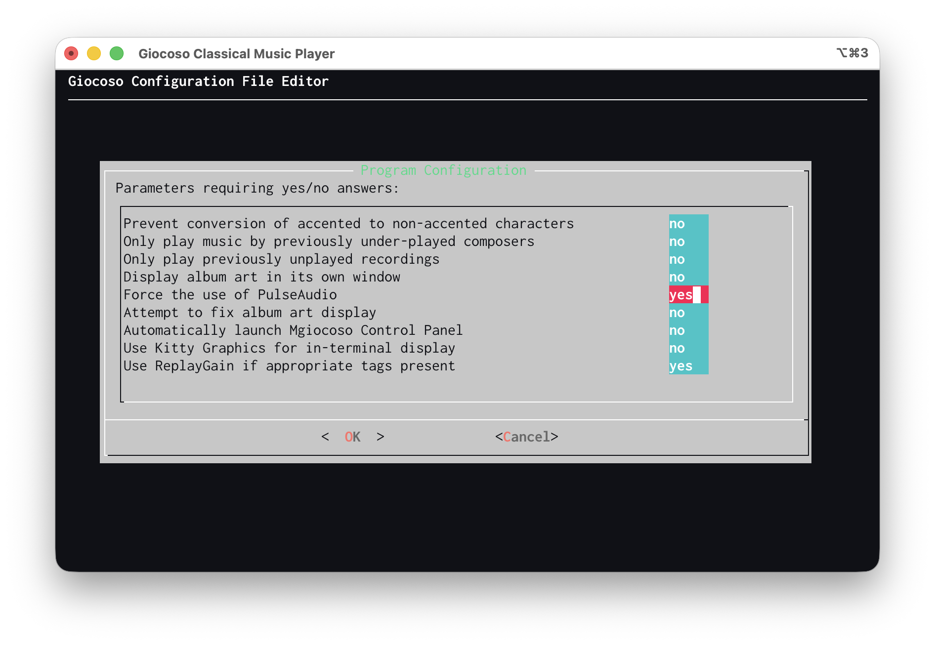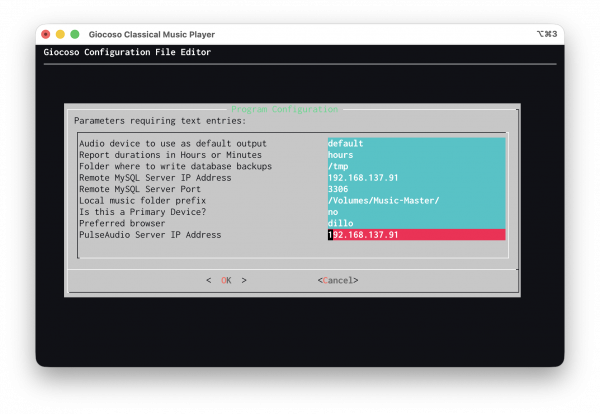 Here, the “Force the use of PulseAudio” configuration item has been set to yes (it defaults to a 'no' value). Only when this says 'yes' and a PulseAudio server's IP address has been configured using either the main Giocoso program or the mini player will music be played on one PC and sounded out on another.