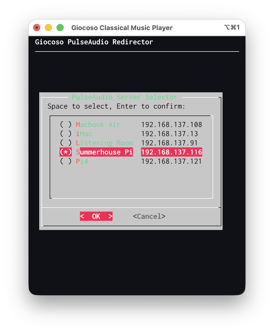 All this now means that if you were to initiate play from either the mini player (by tapping the 'P' key) or from the main Giocoso play menu, the resulting audio stream would “sound out” on the .116 computer: and the birds and I would be happy!