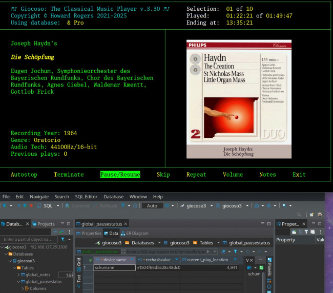 You can see Giocoso is playing some Haydn at the top of the screen; beneath is the DBeaver display of the GLOBAL_PAUSESTATUS table …and it is completely empty, with no records of any sort in it. Now let me pause the Haydn play: