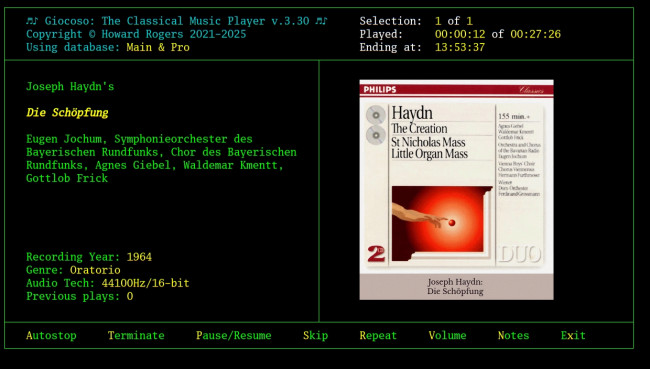 Notice how the new session suddenly thinks that Haydn's Creation only lasts for 27 minutes, when the original knew it lasts for over and hour and three quarters?! That's because the resuming session is only told what's left of a recording to play, not what the actual length of the recording would be if it was playing it from the start. You'll also notice that where the first session had been playing the Creation as one of a series of 10 plays in succession, the resuming session is only playing this one recording and then it will stop playing anything further. Resumed plays are not part of a 'cycle of plays', in other words, but are considered to be one-off affairs.