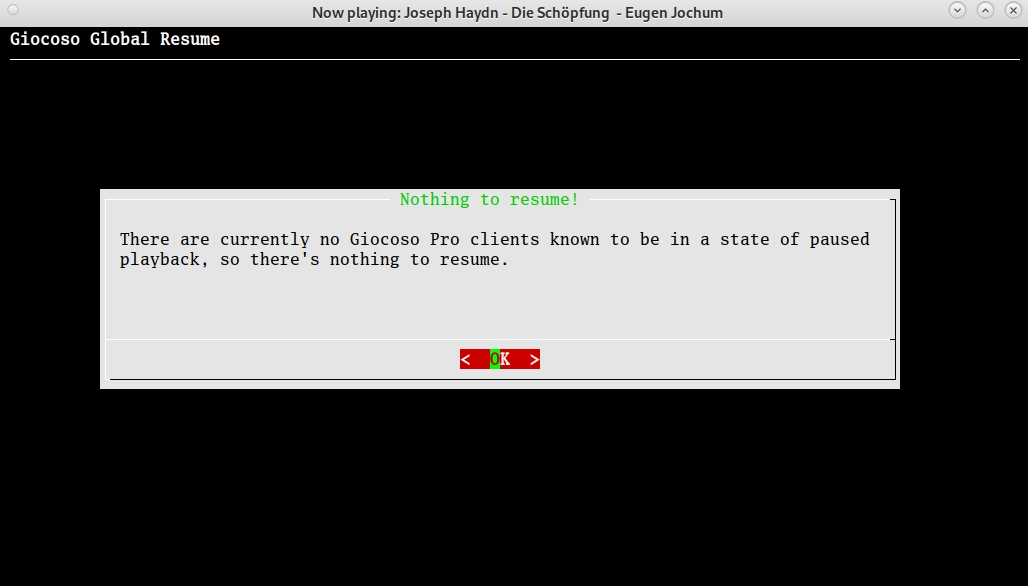 When multiple Giocoso devices have paused their playback, the PAUSESTATUS table in the Giocoso Pro Server will contain multiple rows. A new session coming along and asking to resume playback therefore has to be prompted to say which playback it wants to resume. Taking the Play Music menu, Option 6 on a third PC whilst two others are paused therefore triggers this display: