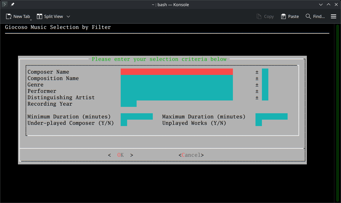 You can fill in as many filters as you like, or none at all (if you fill none in and just press [Enter] to submit a blank form, you are effectively doing a 'play music with defaults', equivalent to taking option 1). If the combination of filters make no logical sense, no music will be selected for playback (for example: you say 'Composer Name=Mozart' and then say 'Composition Name=Fidelio'… since that opera was written by Beethoven, there won't be any recordings that match both selection filters). Filters are always case insensitive: it makes no difference whether you search for “liszt” or “LISZT” or even “LiSzT”. If the recording has been tagged as being by “Liszt”, all three capitalisations will find it. Filters are also always wild-carded, by which I mean that a search for 'brit' will match “Britten”, and one for “amad” will match “Wolfgang Amadeus Mozart”.