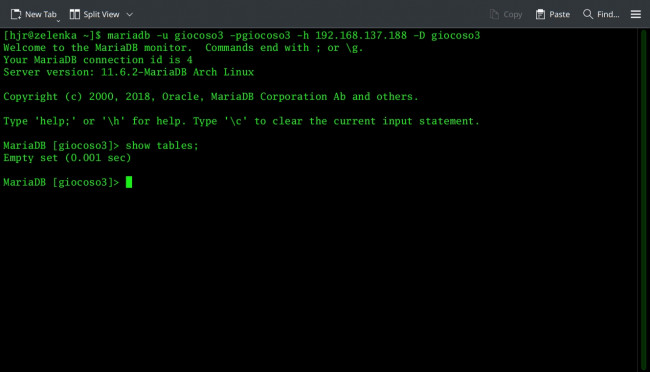 mariadb -u giocoso3 -pgiocoso3 -h 192.168.137.187 -D giocoso3 --skip-ssl
