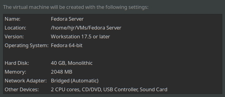 I'm building a virtual machine in which to install Fedora Server: I've deliberately configured it with fairly minimal resource settings: