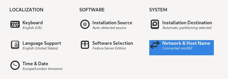 They're really all the things you need to consider at operating system installation time: non-root user account, fixed IP address, standard/default disk partitioning and software selections. After that, you just click the 'Begin installation' button and sit back and wait. It took about 10 minutes for the O/S installation to complete for me.