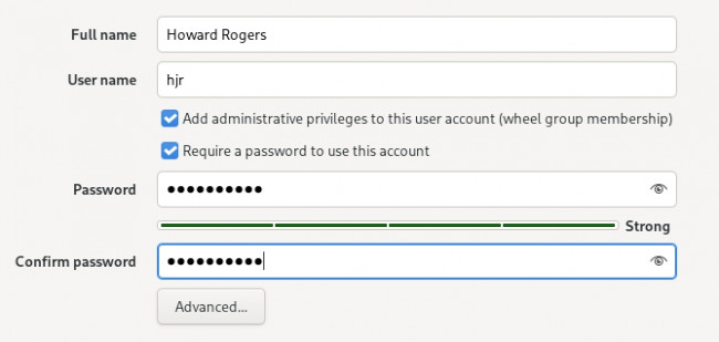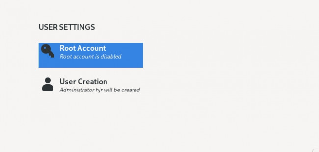 I chose to leave the root account disabled. It would be like that in Ubuntu Server, for example, without even asking you about it …and isn't a bad thing to do in any distro. Provided there is a non-root administrator account created (as you can see my 'hjr' account will be), you can always exercise root powers via the magic of the sudo command, so there's no need to ever actually be root directly.