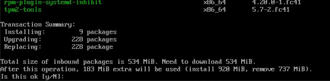 On Ubuntu or Debian, you'd type 'sudo apt update && sudo apt upgrade'; on Arch it would be 'sudo pacman -Syu'; on OpenSuse, 'sudo zypper update' and on FreeBSD, 'pkg update'. All do the same thing: inspect the software on the system, fetch updates to all of it from across the Internet, then apply it. On Fedora, my update was not terribly big: