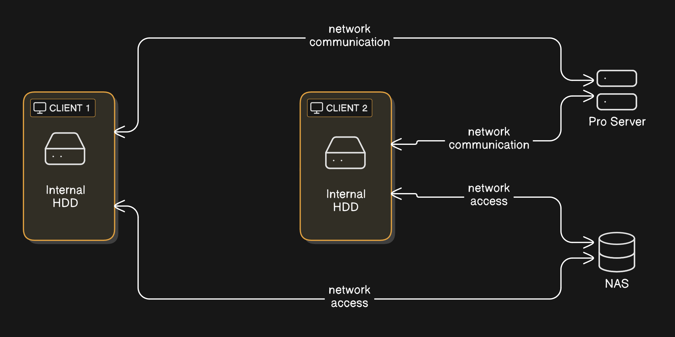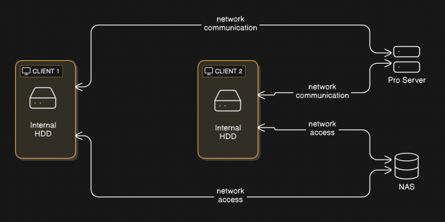 Since each client can see the same Pro server as the other(s), what one client writes there, the other can immediately read intelligibly. If the first client says “There's a Beethoven symphony stored in folder X”, because 'X' is a folder on the shared NAS device, that's going to be true for the second client too. And if the second device says, “I played a Mozart concerto found in folder Y”, the first client will immediately know precisely what concerto was played because it too can see 'folder Y'. In short: what one device can see, all others can see too.