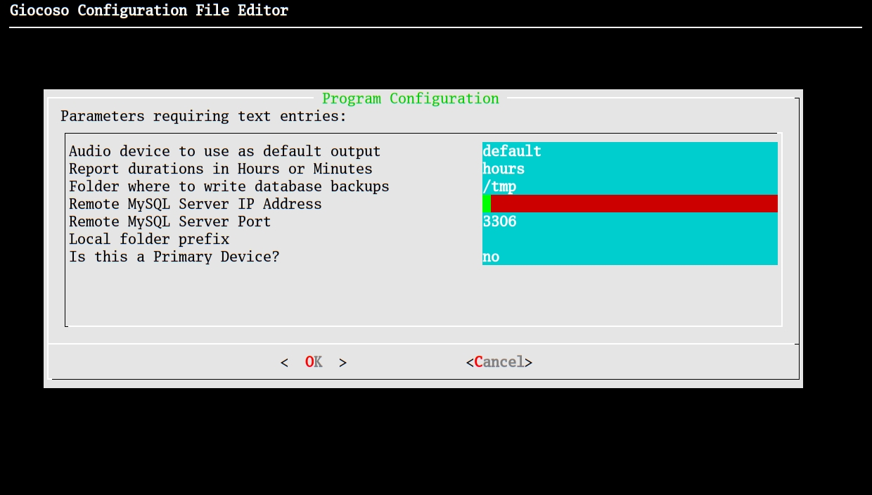 For now, it's important to know that Pro features are turned on by setting a value for the MySQL Server IP Address parameter. If it is blank (as shown above, and as it will be by default) then all Pro features are turned off. The IP address needs to be the IP address of the server running MySQL that has already been configured to act as a Giocoso Pro database. That will vary, depending on your own home network setup and configuration -but the client PC definitely needs to be able to connect to it over the network. Note that the IP Address parameter has to be a raw IP address, not a hostname that is resolved into an address via a DNS server or a hosts file. Giocoso checks any entry here at the point of submission and will blank out anything that is not submitted in the form a.b.c.d, where a, b, c and d are all numbers between 0 and 255. However, Giocoso does not check that the IP address entered actually exists on your network or is contactable by the client PC …or that, even though it's contactable, whether or not a MySQL database can be reached at the address. So: typing in a nonsensical IP address will generate an error; but typing in a sensible address that happens not to exist won't generate a thing -though all attempts to play some music after making such an entry will fail.