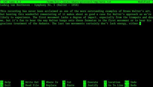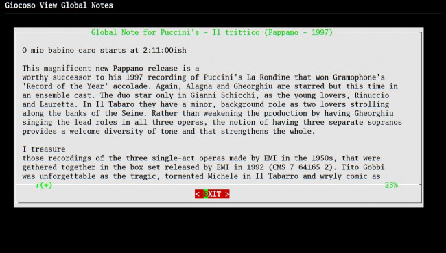 In either case, you can just start typing your notes and observations as before. You will note that the text wraps when needed, but not particularly nicely (see, for example, the way 'from the trumpets and drums' wraps in the above screenshot on line 3 of the main text): it is a basic text editor that's being used for its simplicity and ubiquity, not because it handles long lines of text particularly well! Once you're done writing, the edited text is saved (by pressing Ctrl+X) and, at that point, it is written back to the Pro database: no copy of the text is stored locally, at all. Once nano closes, Giocoso returns back to the 'now playing' screen, which continued to run in the background for as long as you were editing text.