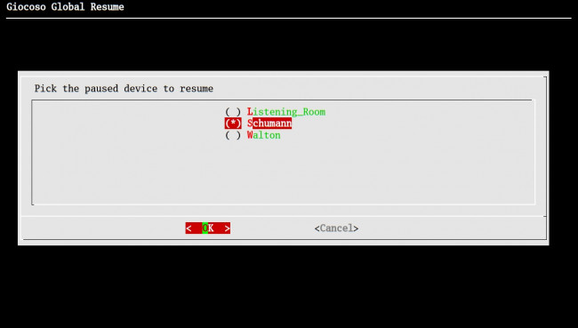 The resumption is not perfect: Giocoso rounds things to whole seconds, so playback resumption might skip a fraction of unplayed music, or repeat a fraction of played music. The resumption on a second device also doesn't stop the original client device from thinking it's paused in the middle of playback: if you were to return to the original device, it will still think it's paused in the middle of whatever piece it had been playing. You can always simply hit the 'Terminate' option to deal with this, of course -though listening to a good opera second time round is no bad thing, either!