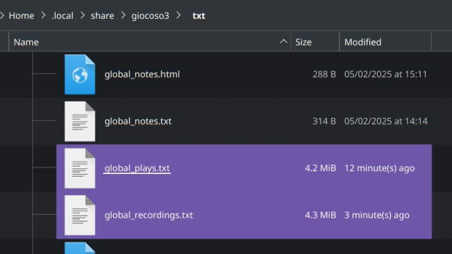 The Pro menu, Option 5 extracts the remote PLAYS table data to a local text file; Option 6 does the same thing for the remote RECORDINGS table. Both options write their output into the $HOME/.local/share/giocoso3/txt folder, over-writing any previous data extraction when it does so, without prompting. Note that the term 'extracting' does not imply that any data is actually removed from the Pro database: it definitely isn't, and the Pro database remains fully populated and functional no matter how many times you take these options. “Extracting” in this context simply means “making a copy of”, in a totally non-destructive manner.