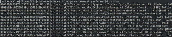 You'll note that the lines of data are very long -but you should be able to make out the pipe delimiters separating the different bits of information about each play or recording. In this state, you could certainly search for particular strings of data, but it's obviously not terribly useful to see the data this way.