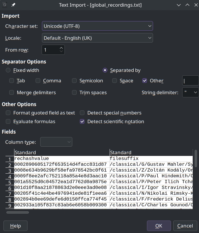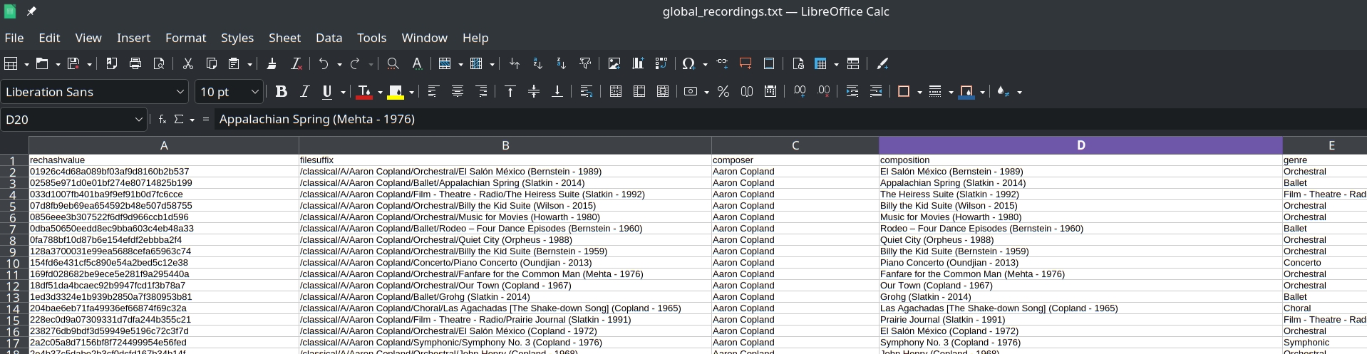 Some people might find using a tool like this a bit daunting, however, and therefore Giocoso allows the remote recordings and plays data to be extracted to a local “CSV” file. The abbreviation 'CSV' means 'comma separated variable', where each piece of distinct data is separated from the next by a comma. However, classical music has names such as “Serenade for tenor, horn and strings” to deal with… and the extra comma in that name could cause trouble! Therefore, Giocoso actually uses the pipe character (i.e., | ) to separate the various bits of data: so you'll end up with something more like “Benjamin Britten|Serenade for tenor, horn and strings|Peter Pears” and so on. Regardless of what the data delimiter actually is, however, you can simply import a “CSV” file into a spreadsheet tool like Excel or LibreOffice Calc and have the data presented to you in easily-readable format, without the need to install specialist database management tools first.