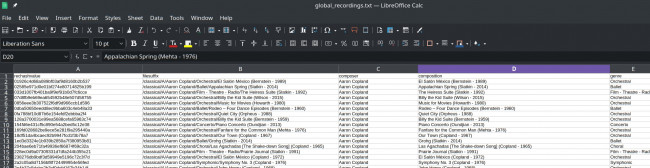 The data is then imported in a much more usable form than before: you may well have to fiddle with column widths and row heights and all the other formatting paraphernalia that modern spreadsheet programs provide, but at least the data is intelligible! By default, the data is extracted in composer-name order, but you can use the spreadsheet's options for sorting data to achieve a sort on any of the columns you like.