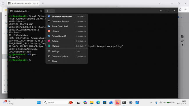 As you can see, that displays options as to which sort of terminal session you want opened, and Ubuntu is listed there, with its familiar roundel icon. Click that and a new terminal tab will open, in Ubuntu's trademarked purple hue, giving you a strong visual clue that you are indeed using Ubuntu at this point.