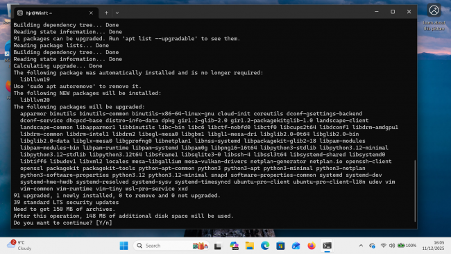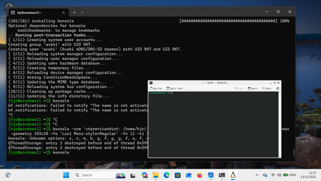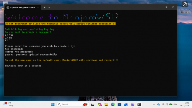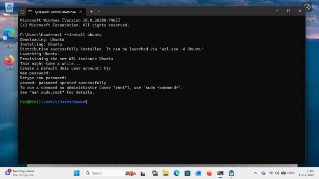 As you can see, Windows pulls down various software packages, installs them and then 'provisions' them for you. At the end of that process, you are prompted to supply a new username and password combo: this will be the Linux user, which is not the same as the Windows user at all. If you choose to type in, when prompted, the same username as you use to log onto Windows 11 in the first place, that's perfectly fine… but you don't have to do that. Similarly, your Linux password does not have to match your Windows one… but they can do so if it makes it easier for you.