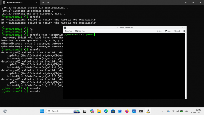 You'll note that the window is tiny and really not much use for anything. To fix that, click the 'hamburger menu' (three horizontal lines) at the top right of the konsole window. Select settings → Configure Konsole…. On the General options, uncheck the option to 'Remember window size'. Switch to the 'Profiles' option. Click New, then create a new profile that sets the initial terminal size to 103 columns and 28 rows. Click Appearance, and select 'Green on Black'. Click on the [Choose] button to alter the font: select Luxi Mono at 14pt. Click OK. On the list of profiles, select the profile you just created and click the 'Set as Default' button. Click [OK] once more. Now you can close the existing konsole session and start a new one. The new konsole window should open looking much more usable: