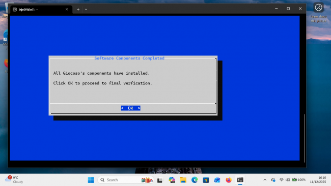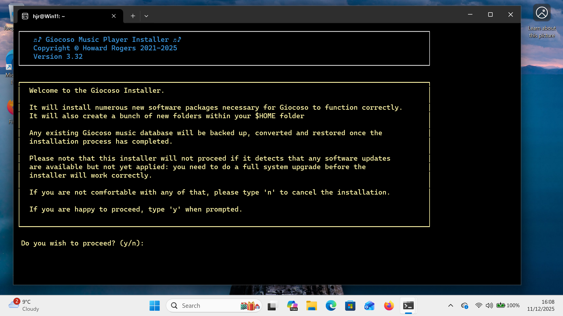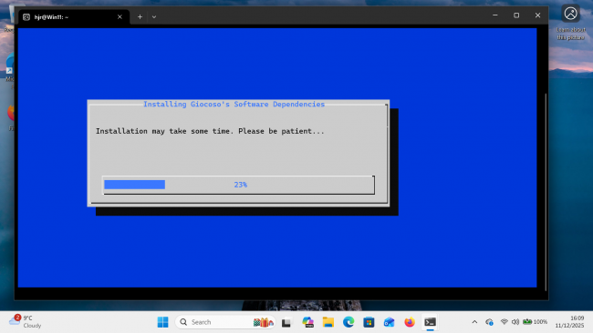 Apart from the need to install either ncurses or wget manually before the Giocoso installer can be launched successfully, therefore, there's little difference between running Giocoso running on Windows via Ubuntu, Debian or Fedora. The choice of distro to host the Giocoso installation is therefore largely immaterial. Arch is suit generis however… and I can't honestly recommend trying to run Giocoso on that distro within Windows.