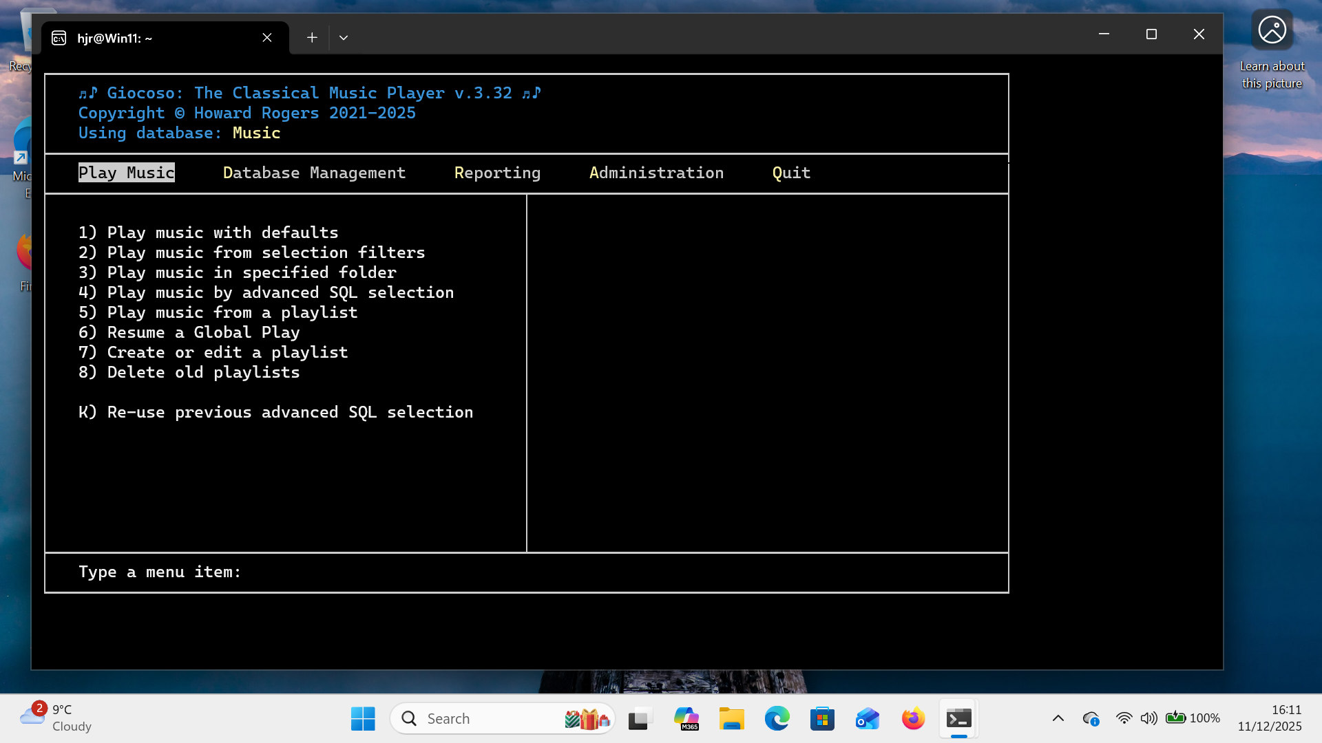 The basic principle of getting Giocoso working on Windows 11 is to install the Windows Subsystem for Linux (WSL) onto your Windows system, then install a Linux distro of your choice, and finally install Giocoso into that distro. It is, in other words, a cheat! Giocoso is, essentially, a Bash script that orchestrates a number of Linux programs and utilities to play music: it doesn't really run on Windows at all… but thanks to WSL, Windows can run Linux, and if Linux is running, Giocoso can run within that.