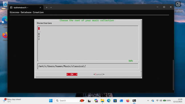 …inside a sub-folder called 'classical' and within additional sub-folders named after the initial letter of each composer's first name. You'll recall from Section 3 above, however, that the Linux environment sees the C: drive at '/mnt/c', so my Windows path needs to be converted to /mnt/c/Users/hawen/Music/classical. I could just type that into the horizontal panel of the Giocoso folder selection screen or I could use the upper panel to navigate to that location: either method works equally well, so long as Giocoso ends up 'inside' the folder, looking at the initial-letter sub-folders, as you see in the above screenshot.