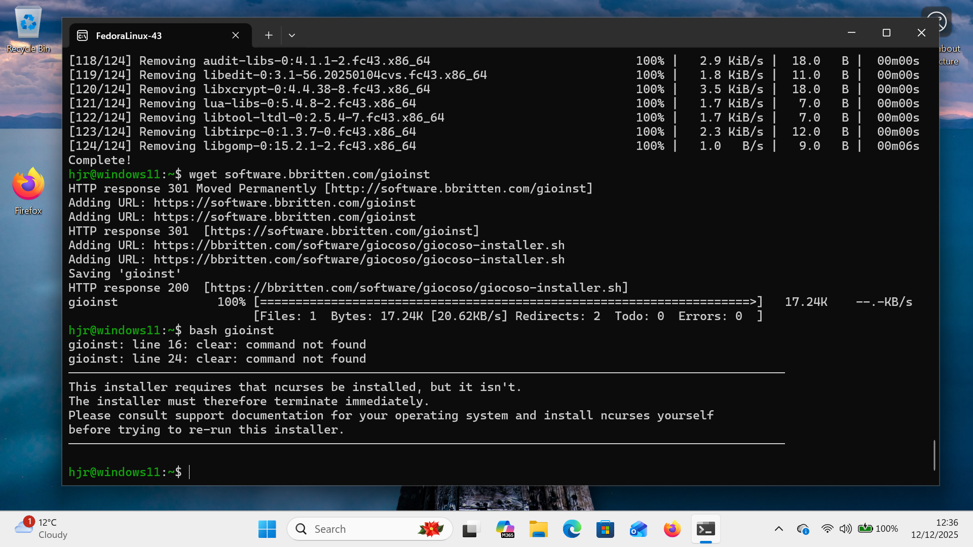 That's the Giocoso installer noticing that ncurses is not a standard part of the Fedora-on-Windows installation. Without it, the installer cannot proceed. You'll therefore need to install it manually: