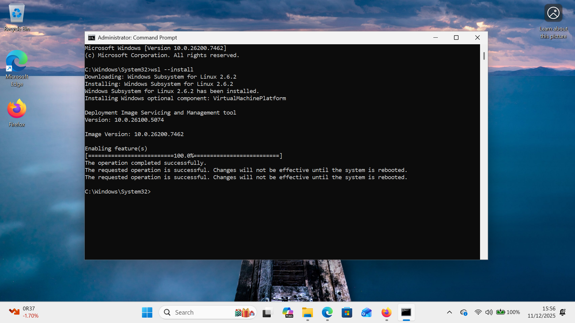 When you see this message, do as it says and reboot your PC to make the new feature available and functional. Once your PC has rebooted, nothing will apparently have happened and nothing terribly Linux-y will be available to you to use! That's because you haven't installed a distro yet… so that's the next thing to do.