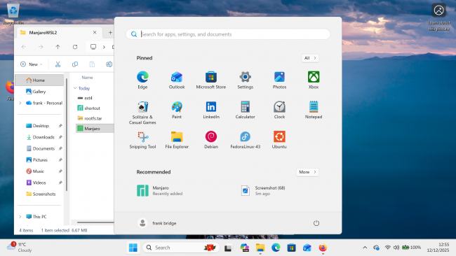 First, obtain your Manjaro-on-WSL software: I've already pointed you to the website I used for that: at the time of writing, the latest release was called “ManjaroWSL2-20251201” and within that section of the site I downloaded the ManjaroWSL2.zip file for that release. Once downloaded, I right-clicked the file and selected the 'Extract All…' menu option. That creates a “ManjaroWSL2” folder, within which you'll find an item called, simply, “Manjaro”. It should be labelled as an 'Application' in one of the columns visible in Windows File Manager. Double-click that item and this happens: