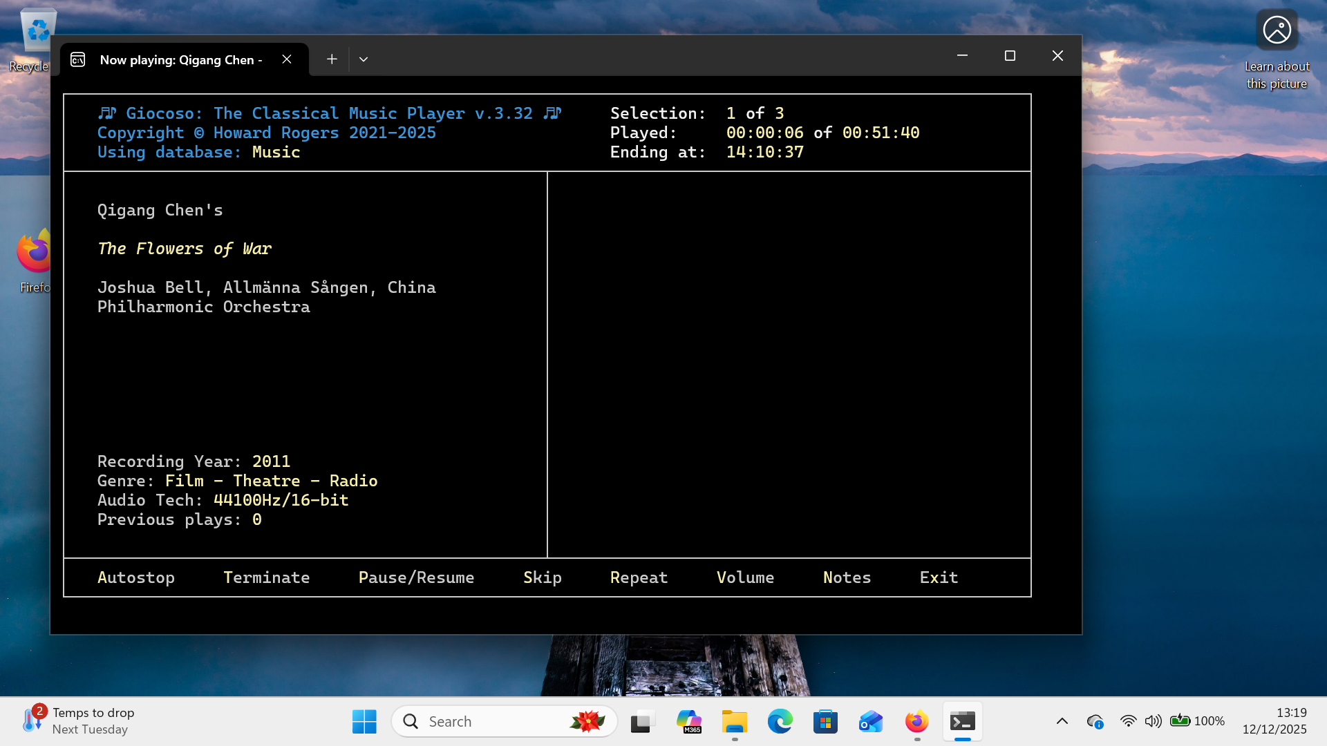 It is at this point that you'll discover that 'non-standard' distros have non-standard quirks! In this case, you can tell that music is playing fine: the counter in the top right of the Giocoso screen is saying we're six seconds into playing a 51 minute recording, for example. But you'll notice that there's no album art: that's because Manjaro-on-WSL's default terminal is not configured to display 'sixel graphics', Giocoso's default mechanism for displaying graphics within a terminal.