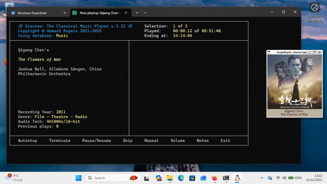 You'll note that Ubuntu-in-Windows has zero difficulty displaying the album art for a FLAC …and you'll have to take my word for it that my laptop's speakers were full of music, sounding great, as intended! Giocoso on Windows (via Ubuntu) thus works perfectly.