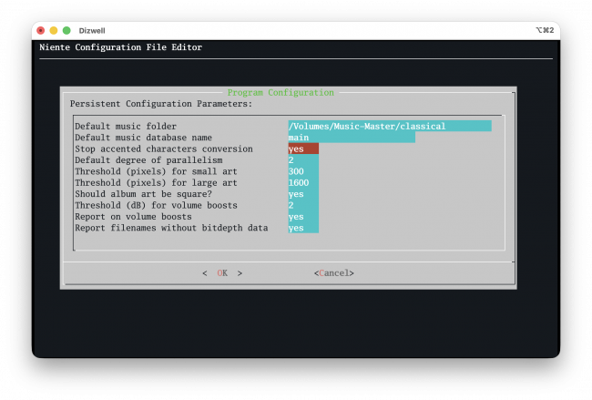 …in which textual prompts are paired with data entry fields. The text prompts use natural language wherever possible and the values you assign to them are also in natural language (for example, the screen uses yes or no answers, rather than binary 1 or 0 values). All possible configuration parameters are displayed and are editable on this one screen. The specific consequence of setting or unsetting any of these parameters should be determined by reading the relevant section of the User Manual: for the meaning of 'Threshold (pixels) for small art', for example, you'd want to consult this page of the manual and, specifically, Section 4.1 since the parameter governs when Niente thinks a piece of embedded album art is too small for its own good!