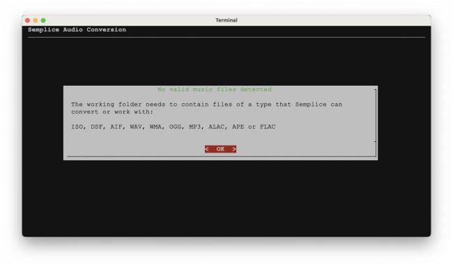 If your working folder contains zero files of a type that Semplice can work with, you'll see this error message instead: