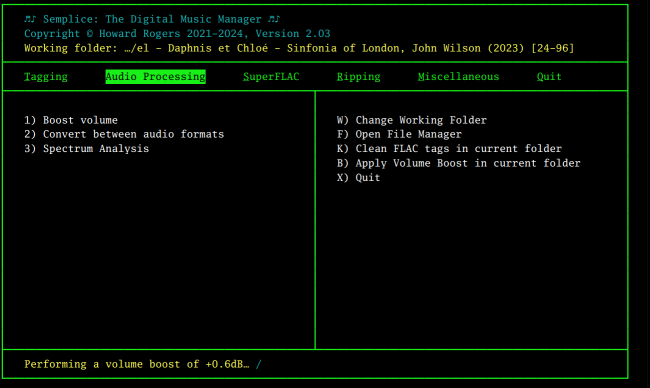 Minor Enhancement: When you perform a volume boost with AUTOBOOST enabled in earlier Semplice versions, if a volume boost can be applied to your FLACs, one will be automatically -but you will have no idea how bigthat volume boost is. New in Version 2.03, therefore, is a very small addition to the status line when an auto-boost is underway that simply tells you how big the volume boost is, like this: