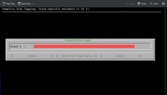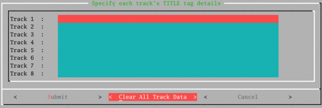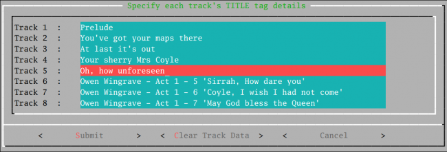 So to clear out every track's existing metadata, you simply arrow down to the next track, press Ctrl+U, rinse and repeat. That approach is probably entirely convenient if you're tagging up a 4-movement symphony. If you're tagging up an 83-track Handel oratorio, however, that approach is going to get very tedious very quickly! Thus the the new enhancement/feature: the bottom of this screen now has a [Clear All Track Data] button in addition to the traditional [Submit] and [Cancel] ones. Tab round to that so that it is highlighted and press [Enter] and this happens:
