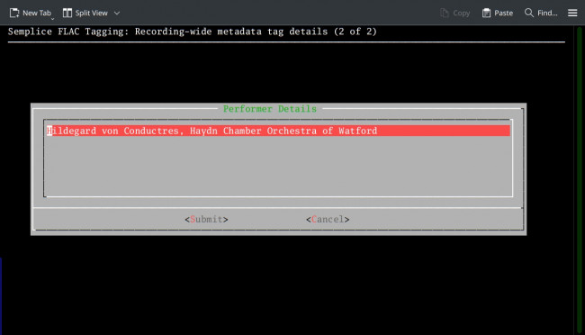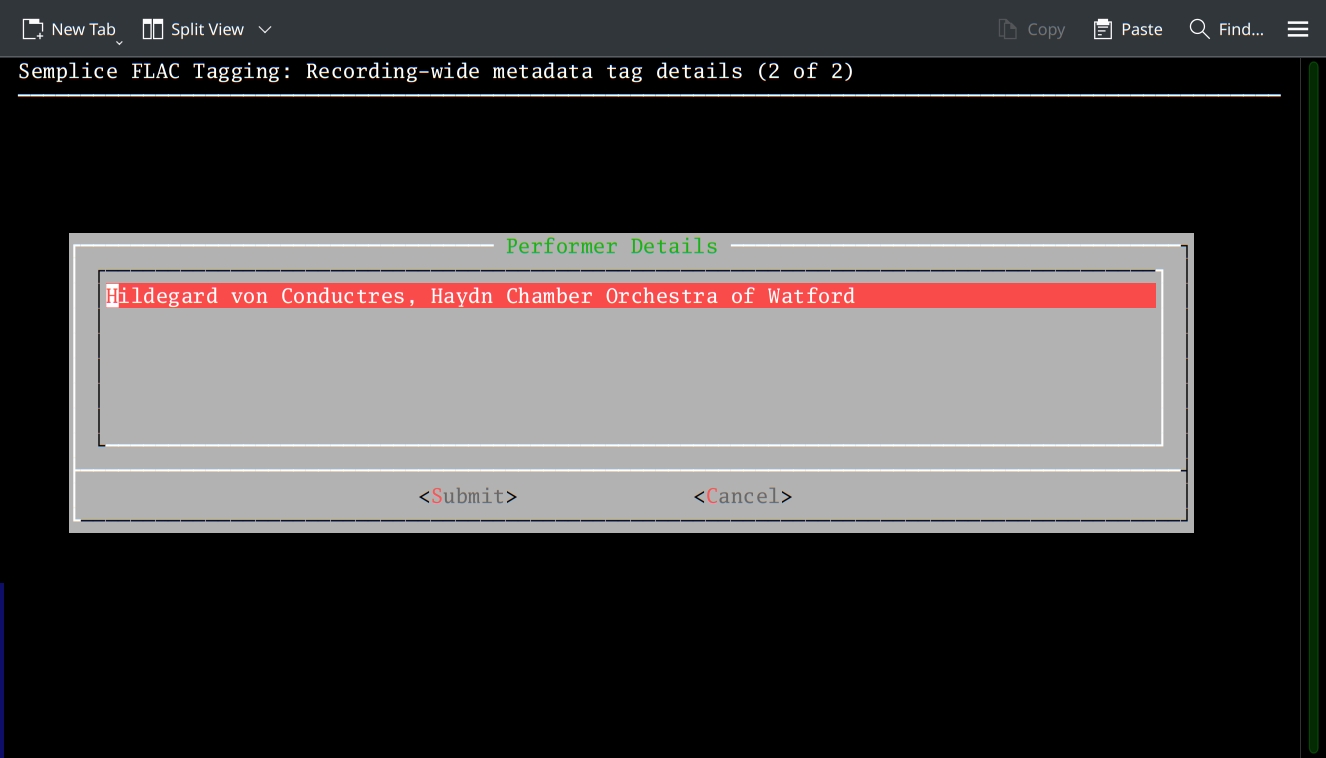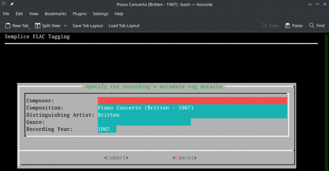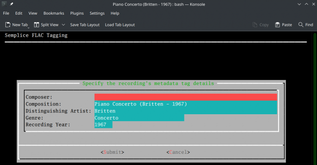 As you can see, the pre-existing metadata has been wiped from the form (even though it's currently still stored within the FLACs) and the form's fields have been replaced with data guessed from the current working folder name. You'll still have to type the composer's name in yourself -and the Distinguishing Artist's first name would be nice to have, too. But if you get the name of your physical working folder correct before invoking Semplice, a lot of the tedium of filling in appropriate tag entries has now been eradicated. Once you press the [Submit] button, your new auto-guessed (and possibly manually tweaked) tags will be written back to the FLACs found within the working folder.