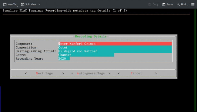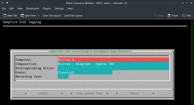 Here I have freshly started tagging inside the 'Piano Concerto (Britten - 1967)' folder and have taken the same 'Read existing metadata' option as normal: unfortunately, on this occasion, the FLACs do have some pre-existing metadata, so Semplice has read it and put it into the various data entry fields on the form. The trouble is, the metadata is just complete nonsense and I don't want to have to step through every field in turn, hit Ctrl+U and wipe it before being able to type in something more sensible. So, instead, I tab around to the new [Auto-guess Tags] button and press [Enter] when it's highlighted: