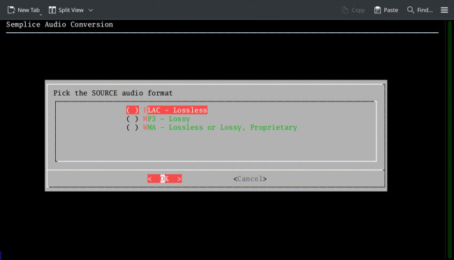 Enhancement: When performing audio conversions, the 'pick the source audio format' dialog box will now only display audio formats that are detected as being present in the current working folder. For example, if a folder doesn't contain any audio files using appropriate codecs, you'll see this:
